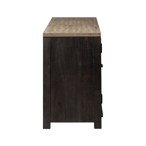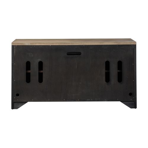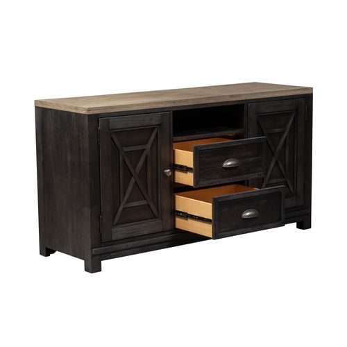 Experience casual interior living with the Heatherbrook 46″ tv console. Crafted with poplar solids with acacia solids and veneers, this piece accommodates most 52″ TVs and features a two toned finish with a charcoal base and ash tops, media compartments, wood framed drawer fronts, a grill accent on door fronts, adjustable shelving and is accented by antiqued pewter knob and cup hardware. The open compartment and wire management provisions effortlessly accommodate electronics or gaming equipment. Product Details * Wood:Â Acacia Solid and Veneer * Finish:Â Charcoal and Ash Finish * Dimensions:Â W46 x D18 x H30 * Box Dimensions:Â W49 x D21 x H34 * Weight:Â 145Â lbs. * Cubes:Â 20.84 Item Features * Features One Adjustable Shelf Behind Each Door * Wire Management In Back & Partition * Sound Bar Area w/ Wire Management * Grid Accents * Block Feet